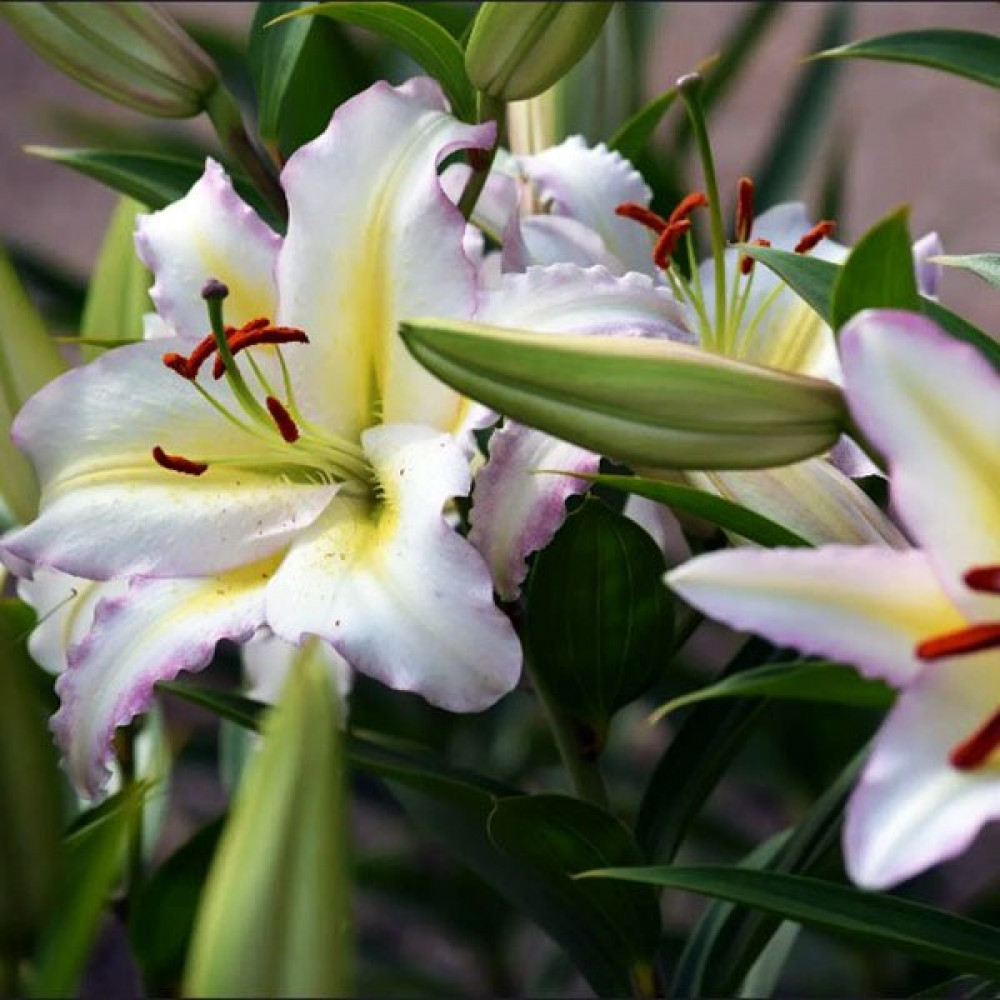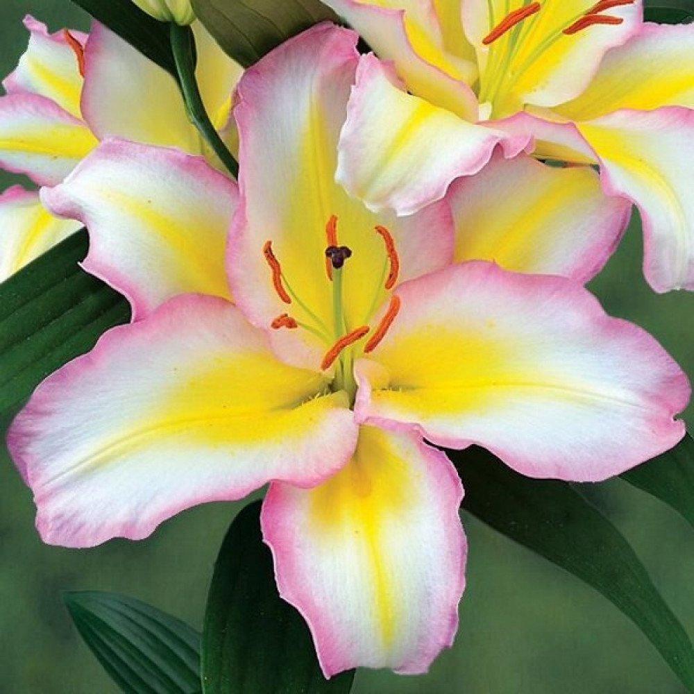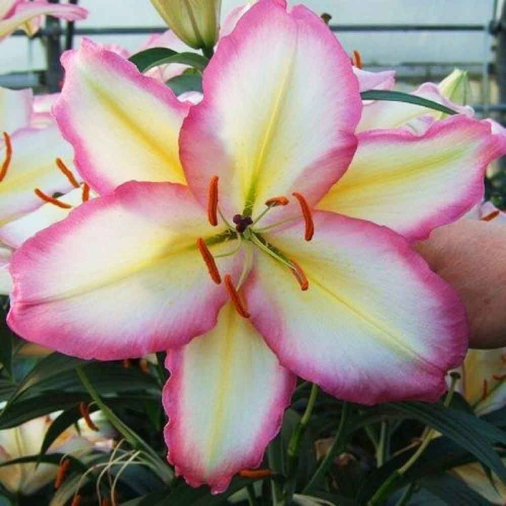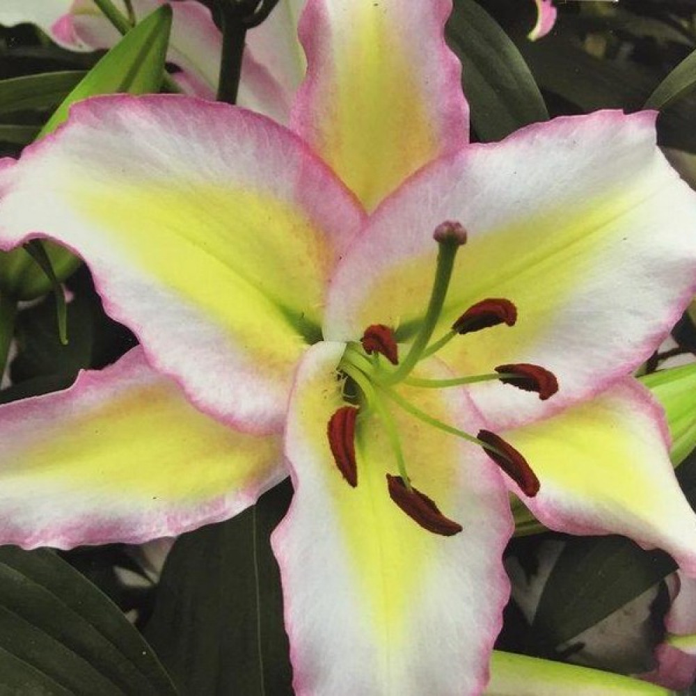 Эффектный восточный гибрид, который будет привлекать взгляды на любой клумбе. Цветок крупный, лепестки широкие, волнистые, белые. По краю тонкий розовый кант. По центру лепестка широкий желтый луч. Имеет насыщенный аромат.