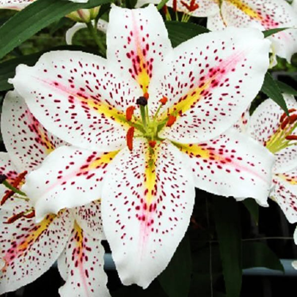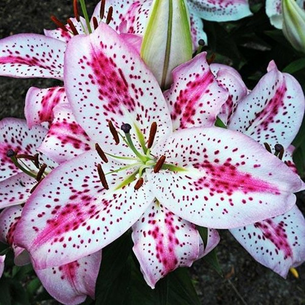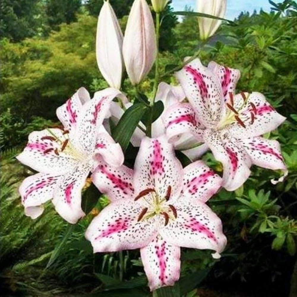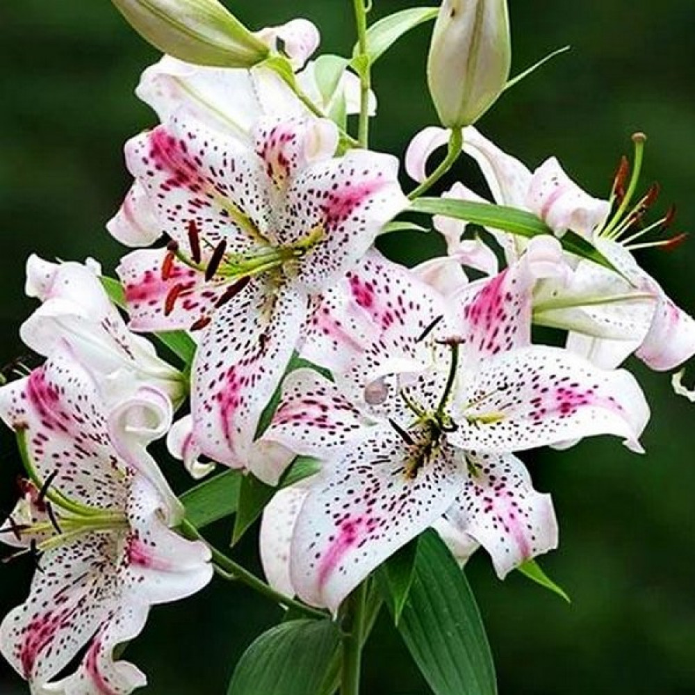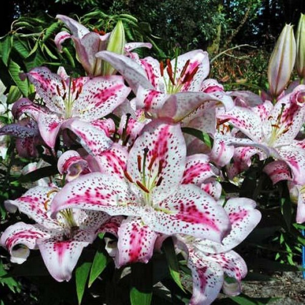Очень эффектный сорт! Цветок крупный белый с желтой звездой в центре, частым темно-розовым крапом и ярко-розовыми мазками посередине каждого лепесточка. Стебли прочные, облиственные. Насыщенный сильный аромат!