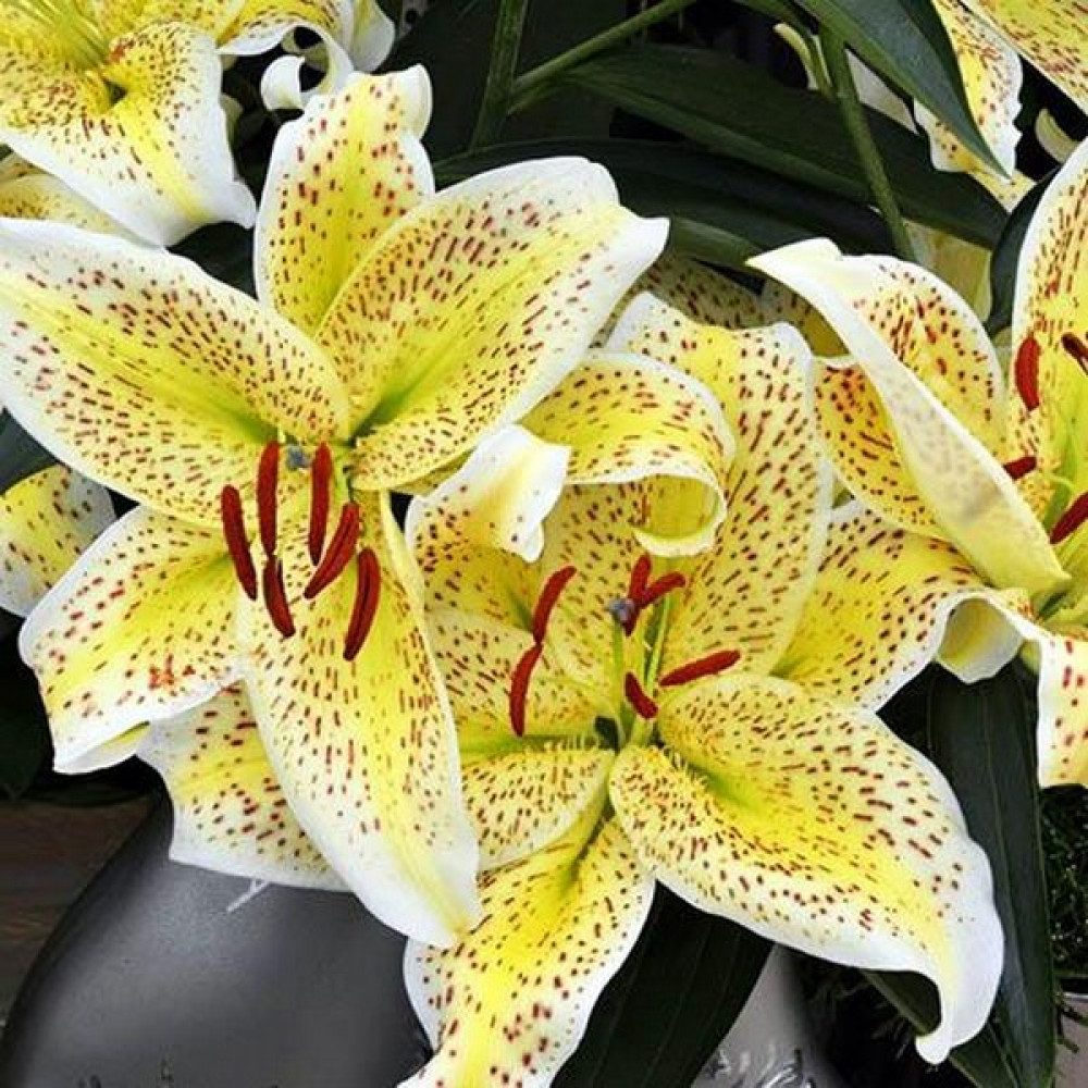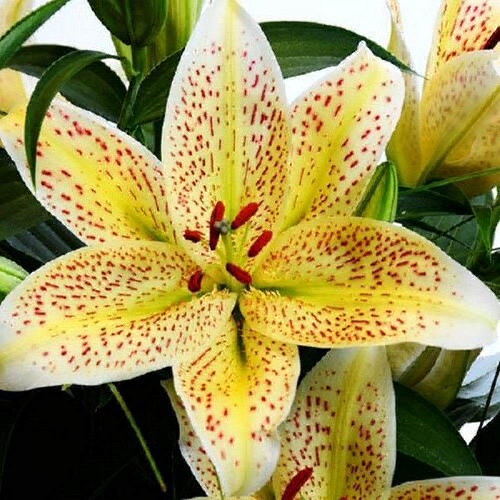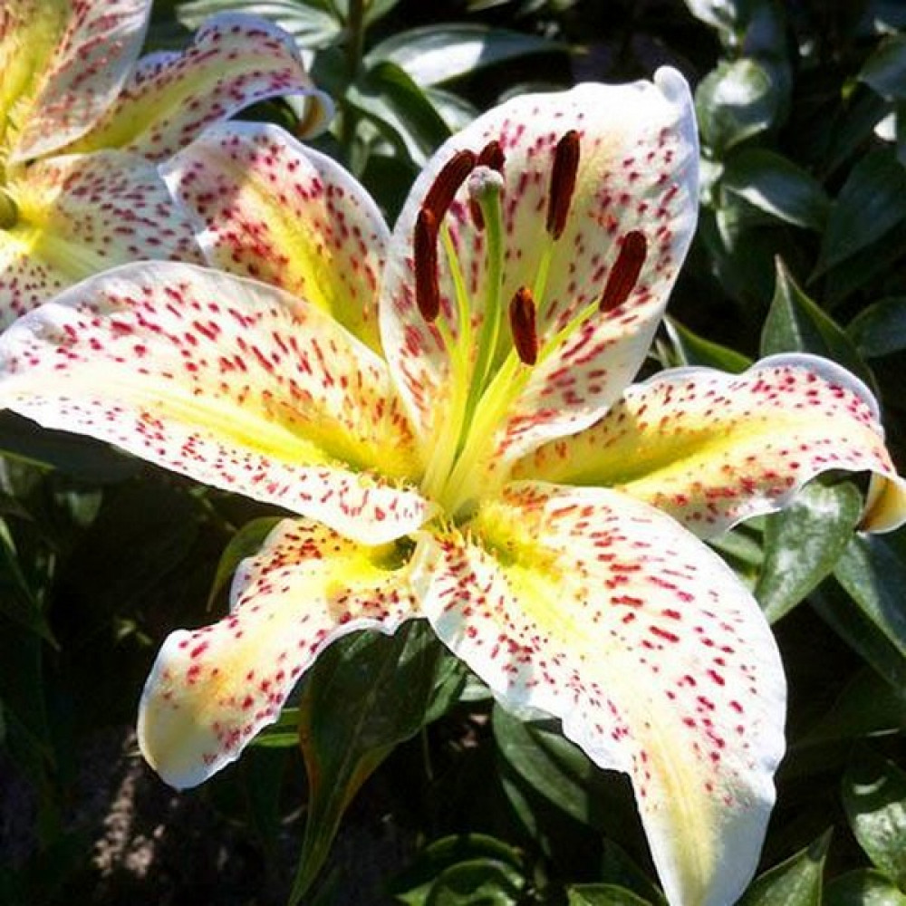 У этой яркой восточной лилии кремовые с желтыми продольными полосами по центру цветы, темно-красный частый крап по всей поверхности лепестков. Отличительной особенностью этой фантастически красавицы являются огромные цветы и благоухающий сладкий аромат. Лепестки слегка волнистые.