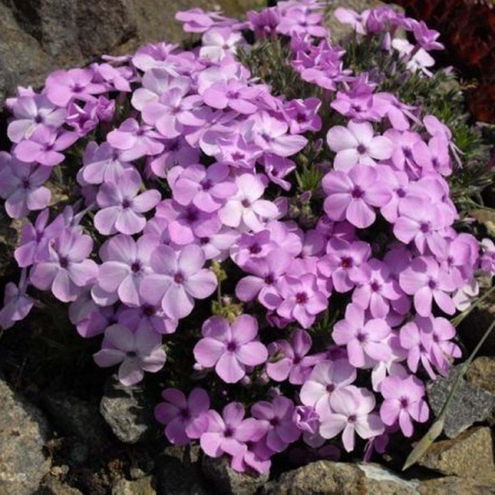 Флокс Дугласа представлен низкорослыми травянистыми растениями высотой до 10 см. Вид относят к почвокровным стелющимся культурам. В процессе роста растение формирует компактные, густо-облиственные, карликовые подушечки округлой формы. Стебли плотные, распростертые. Листва жесткая, темно-зеленая, шиловидная, длиной не более 1-1,5 см. Цветки некрупные, сидячие, светло-лиловые, темно-пурпурные, пурпурные, белые, фиолетовые, лавандово-голубые, темно-красные, розовые или карминно-красные, собраны в головчатые соцветия по 1-3 штуки. Цветки могут быть оснащены более темным или другого оттенка глазком. Цветет флокс Дугласа в конце мая – начале июня, часто наблюдается повторное цветение в августе. Цветение обильное. Сорт представлен растениями с нежно-сиреневыми цветками. Пригоден для миксбордеров, альпийских горок и других типов цветников.