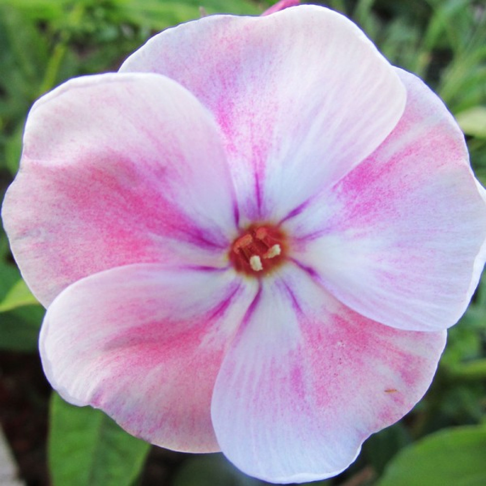 Нежно-розовый флокс с неяркими беловатыми мазками и светло-пурпурным колечком в центре. Соцветие округло-коническое, большое, плотное. Куст красивый, прочный. Высота 70 см.
