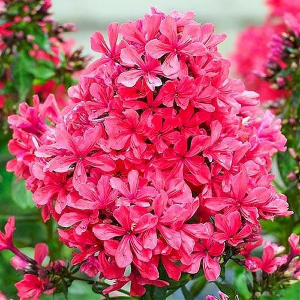 Эффектная новинка. Цветки вишнёво-розовые, ароматные, очень необычные, звездообразные, могут иметь дополнительный ряд коротких зачаточных лепестков. Благодаря, дополнительным недоразвитым лепесткам, которые приросли к нижнему (основному) ряду лепестков, цветок выглядит более "пушистым". Обладает приятным ароматом. Флокс метельчатый Cleopatra (Клеопатра) практически не поражается мучнистой росой, пятнистостью листьев и другими грибными заболеваниями.