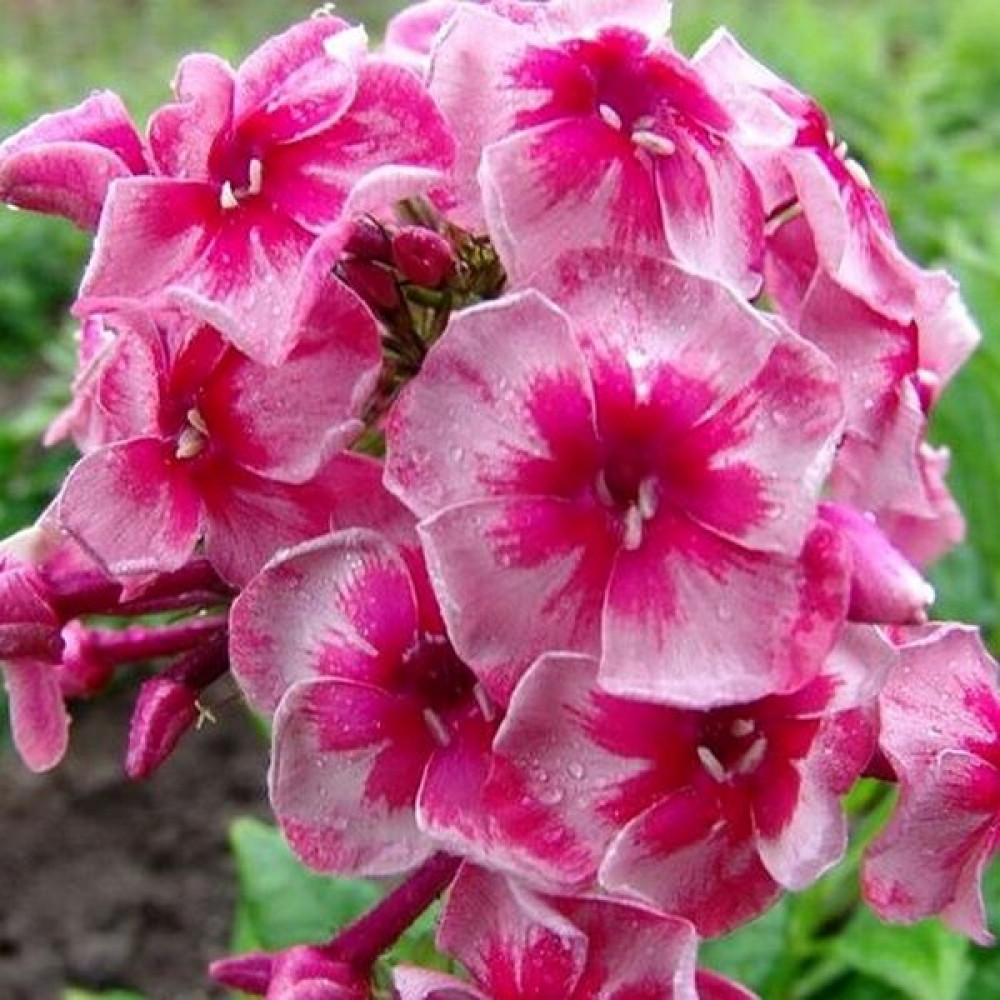 Крупноцветковый флокс с очаровательными, необычно окрашенными цветками. Лепестки ало-розовые с малиновыми и серебристыми штрихами, с ярко-алым горлом. Стебли прочные, прямые, к концу вегетации одревесневающие. Цветение обильное. Для посадки наиболее подходит полутень, так как на солнце цветки выгорают, а в тени растение - плохо цветет. Неприхотливый многолетник, но лучше растет на рыхлой, хорошо удобренной, влажной почве. Быстро разрастается.