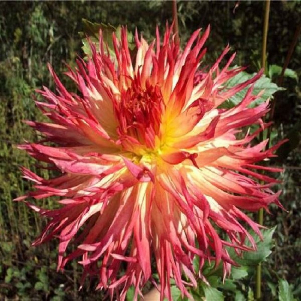 Цветение: коралловый с жёлтым центром, расщеплённые кончики.