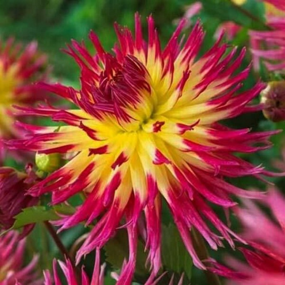 Георгина бахромчатая Lindsay Michelle (Линдсэй Мишель) - красивая, экстравагантная георгина с крупными цветками. Лепестки желтые, тонкие, свернутые у краев, кончики - ярко-розовые, чуть рассеченные. Сорт образует куст высотой 90-100 см. Цветы георгины достигают 15-20 см и имеют легкий тропический аромат. Цветет в период с июля по сентябрь.