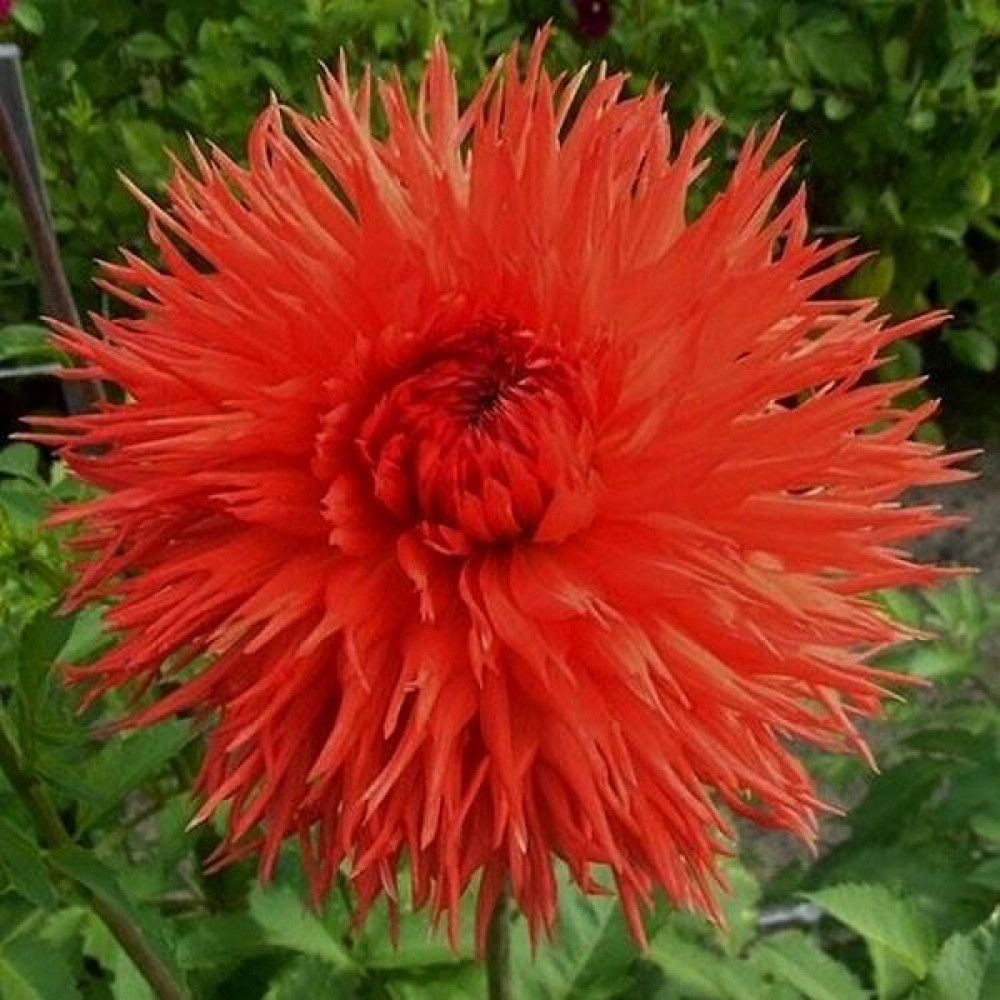 Георгина бахромчатая Mel's Orange Marmelade (Мелз Оранж Мармелад) - махровый остролистный сорт. Цветки из сотен ярко-алых крупных остроконечных лепестков похожи на огромные яркие вечерние звезды. Стебли стройные, прямостоячие, упругие, с насыщенной темно-зеленой листвой, достигают в высоту 120 см.
