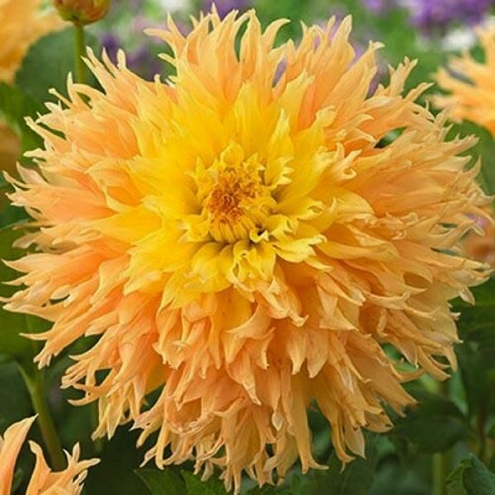 Георгина бахромчатая Mingus Joshua (Мингус Джошуа) - бахромчатая георгина – выведена в США в 1990 годах. Селекционеры прикладывали большие усилия, стремясь вывести бахромчатые сорта с высокой устойчивостью к холоду и крупными цветками. Цель была достигнута – большая часть сортов «Мингус» дают соцветия диаметром более 20 см, все цветки не боятся ночных похолоданий и хорошо цветут даже осенью. Кустики независимо от подвида вырастают небольшими: до 110 см в высоту. Диаметр цветка 15-16 см. Привлекает внимание насыщенными лимонными лепестками, рассеченными на концах, что делает цветок ещё более объемным и декоративным. Части требуется обязательная подвязка, без которой стебель может сломаться из-за большого веса соцветий или порывов ветра.