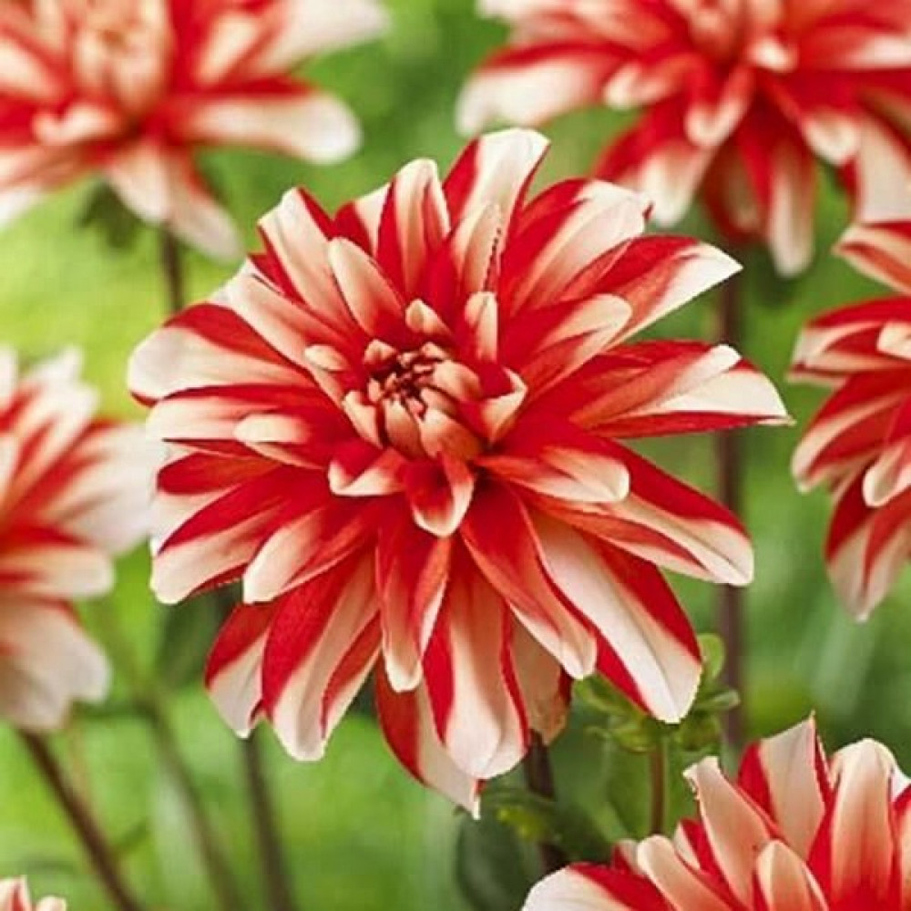 Георгина декоративная Dynamite (Динамит) - однолетнее клубневое растение группы Декоративных георгин. Куст мощный, пышный, стебли полые высотой 80 см. Листья перистые, тёмно-зеленые, многочисленные. Цветок алый с белыми кончиками, на нижних лепестках белые полосы. Лепестки плоские, слегка заостренные. Диаметр цветка - 10 см. Высаживают в конце мая - начале июня, когда минует опасность заморозков. Расстояние между растениями при посадке 30-40 см и 5-7 см над клубнем. Предпочитает солнечные места, защищенные от ветра, плодородные хорошо дренированные почвы. Используется для групповых посадок и на срезку. Цветет с июля по октябрь.