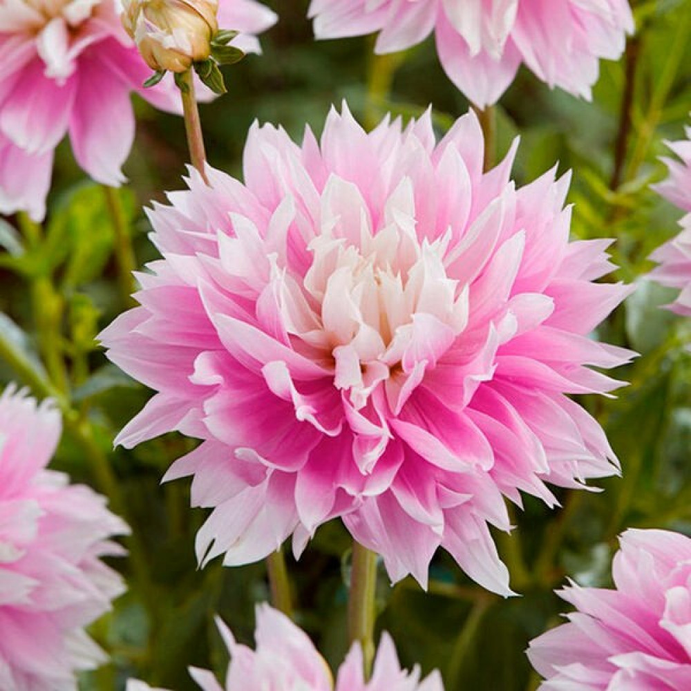 Это самый представительный, многочисленный и разнообразный класс георгин. Полностью махровый цветок. Цвет нежнейший розовый, как будто тающий, с белым центром. Красивое сочетание двух цветов — повод для того, чтобы пополнить свою коллекцию именно георгиной Evanah (Эвана). Основное назначение — для групповых посадок или срезки.