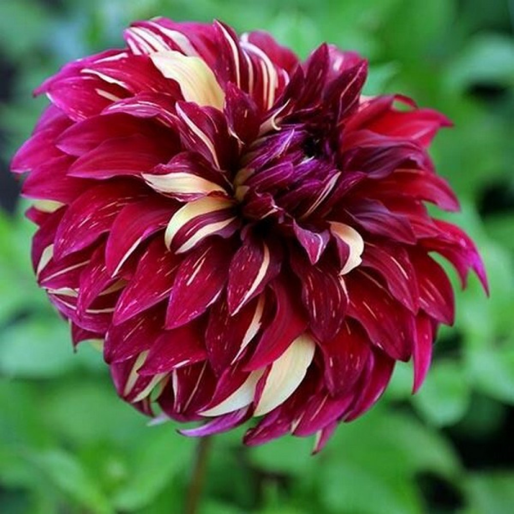 Георгина декоративная макси Bohemian Spartacus (Богемиан Спартакус) - эффектное многолетнее растение. Листья перистые, темно-зеленые, многочисленные. Соцветие бордовое с желтыми полосами. Лепестки плоские, широкие, с заостренными кончиками. Предпочитает солнечные места, защищенные от ветра, плодородные хорошо дренированные почвы. Устойчива к неблагоприятным условиям роста, к болезням и вредителям.