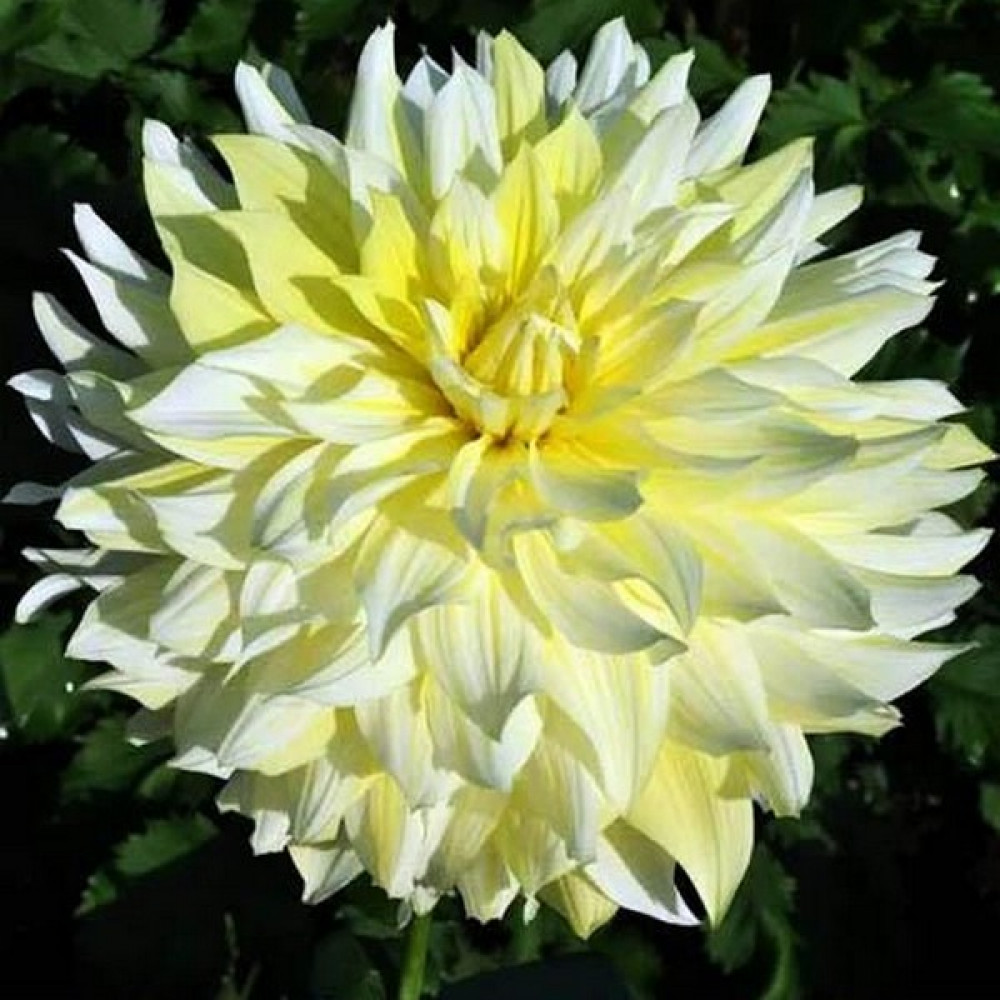 Георгина декоративная макси La Luna (Ла Луна) кремовый со светло-желтыми полосками, эффект свечения. Цветение бурное и продолжительное с июля по октябрь. Для более обильного цветения удаляют боковые бутоны. Идеально подходит для срезки. Георгины светолюбивые растения, поэтому рекомендуется их высаживать на хорошо освещенных местах, защищенных от ветра. Предпочитают легкую, плодородную землю. Георгины неприхотливы и легки в выращивании.