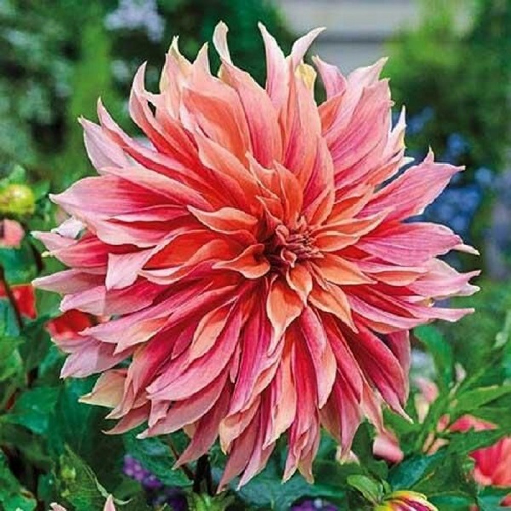 Георгина декоративная макси Labyrinth (Лабиринт) - высота растения 90 см. Цветок диаметром 18 см. Ярко-розовый центр с кремово-розовыми краями, лепестки подкручиваются.