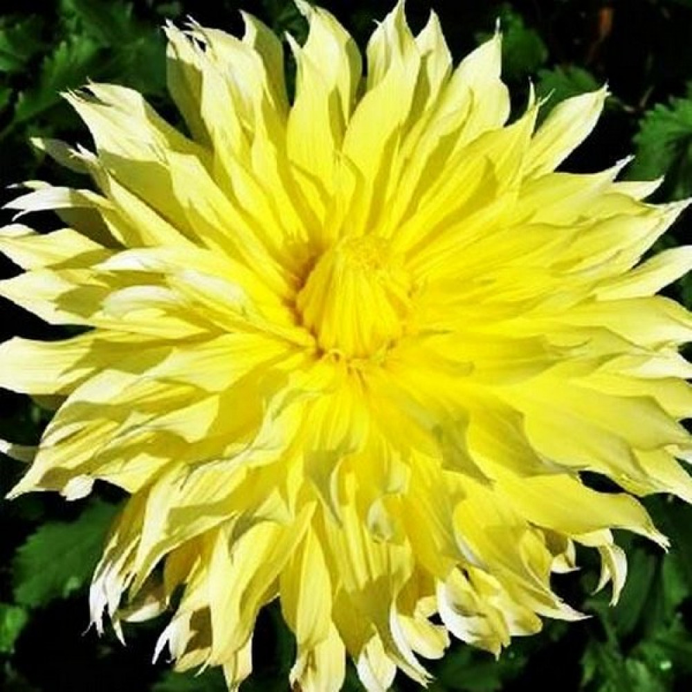 Георгина декоративная макси Ponderosa (Пондероза) Имеет очень продолжительный срок цветения. Данный вид обладает крепкими стеблями, которые не ломаются даже при сильном ветре. Высота растения 100 см. Цветок очень крупный, диаметром 25 см, желтый. Заостренные лепестки слегка закручены. Предпочитает солнечные, защищенные от ветра места, плодородные хорошо дренированные почвы.