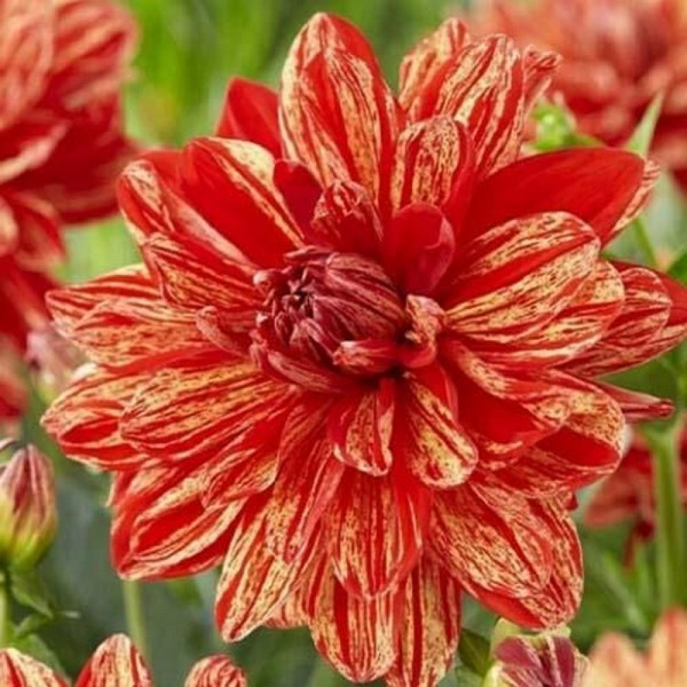 Георгина декоративная Neo (Нео) - цветок алый с желтым меланж, диаметром 18 см, имеет плоские язычковые цветки, слегка закрученные и отогнутые к стеблю. Листья перистые, тёмно-зеленые, многочисленные. Куст мощный, пышный, стебли полые высотой до 90 см. Цветет обильно и продолжительно с июля по сентябрь. Предпочитает солнечные, защищенные от ветра места, плодородные хорошо дренированные почвы. Используется для групповых посадок и на срезку. Не требует дополнительных опор. Устойчива к неблагоприятным условиям, к болезням и вредителям.