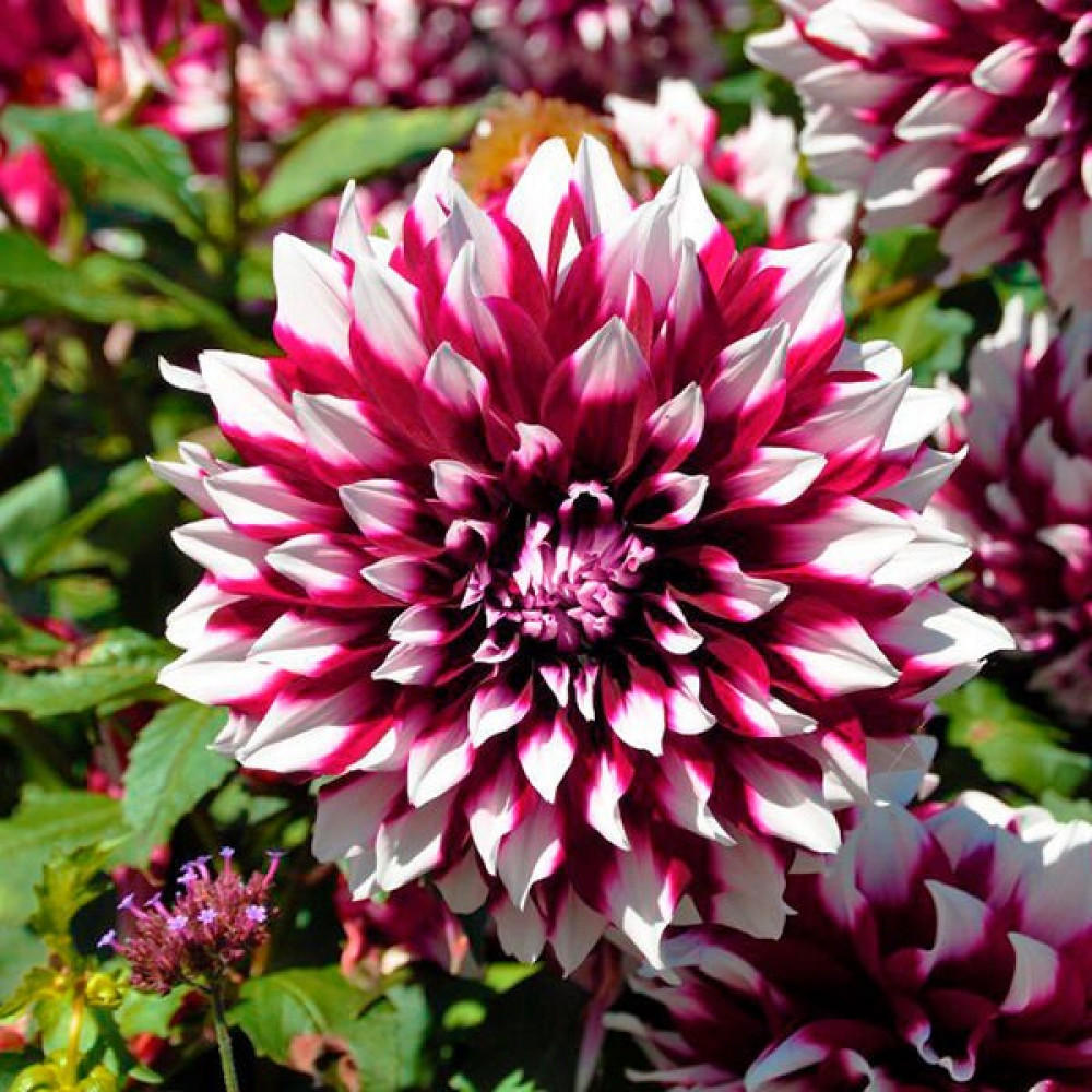 Это самый представительный, многочисленный и разнообразный класс георгин. Полностью махровый цветок. Кончики цветка белые, основной цвет бордовый. Красивое сочетание двух цветов — повод для того, чтобы пополнить свою коллекцию именно георгиной Verdi (Верди). Основное назначение — для групповых посадок или срезки.
