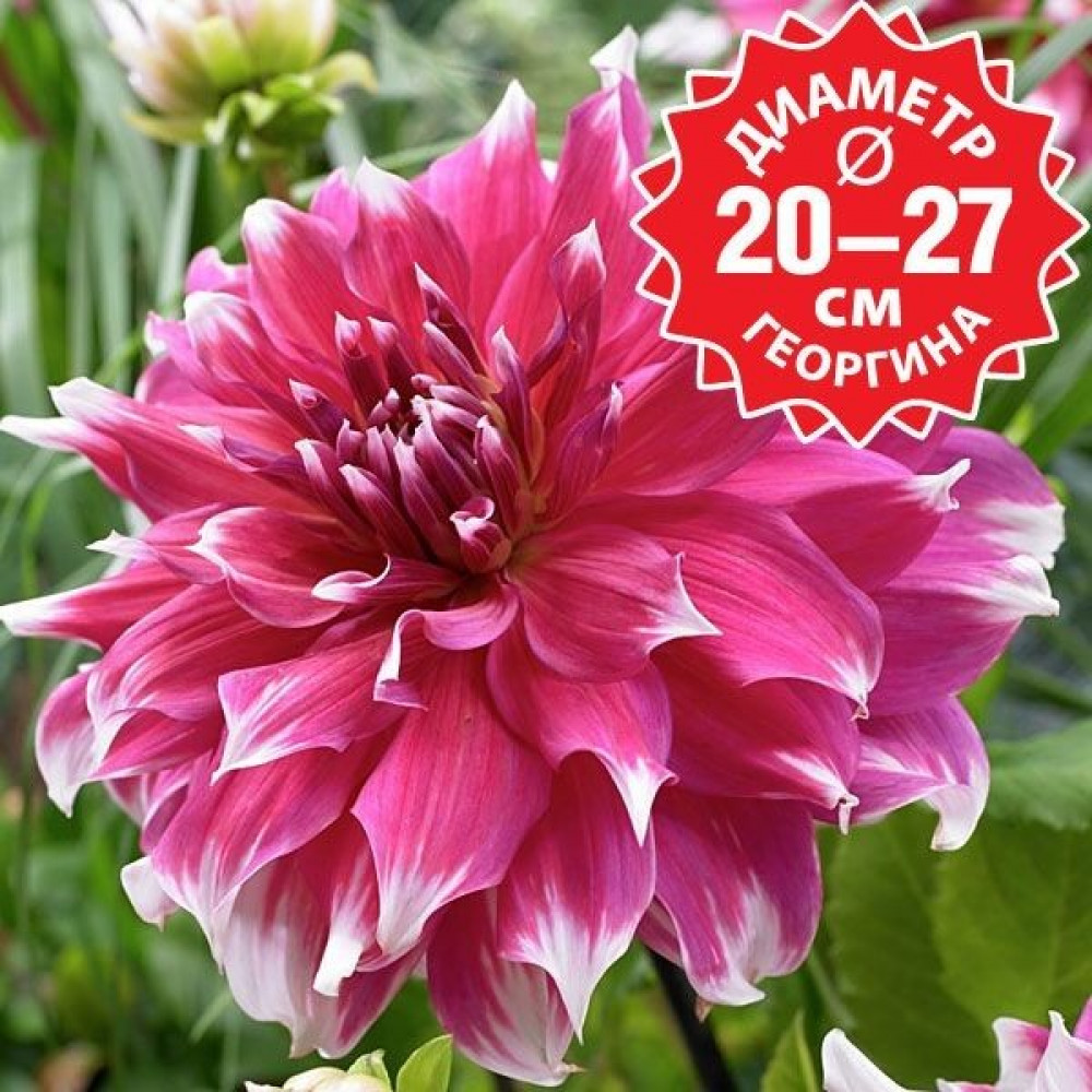 Георгина декоративная макси Frost Nip (Фрост Нип) крупноцветковая, насыщенная малиново-красная с белыми кончиками. Лепестки плоские, широкие, заостренные на концах. Высаживают георгины на хорошо освещенных, защищенных от ветра местах. Предпочитают легкую, плодородную землю. Георгины неприхотливы и легки в выращивании. Размножение происходит путем деления клубней. На зиму клубни выкапывают, просушивают и хранят в сухом прохладном месте. Цветение продолжительное в период с июля по октябрь. Для более обильного цветения удаляют боковые бутоны. Идеально подходит для срезки.