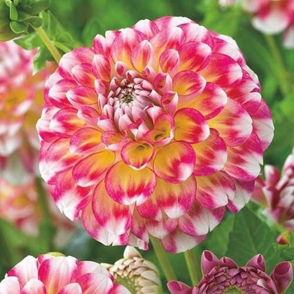 Лепестки георгины сочетают в себе несколько насыщенных цветов:желтый центр, розовая кайма, белые кончики. Высота георгины 60 см. Цветок до 10 см в диаметре. Цветет продолжительное время с июня до октября.