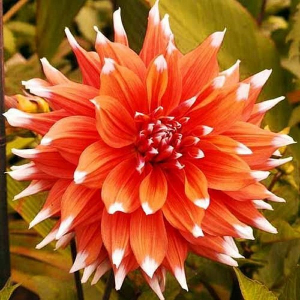 Георгина кактусовая Color Spectacle (Колор Спектакль) - очень яркий, нарядный сорт георгины. Белые кончики лепестков освежают насыщенно-оранжевый цветок. Сорт образует куст высотой 100-110 см. Диаметр цветка 15-20 см. Бутоны образуются с июля и до заморозков.
