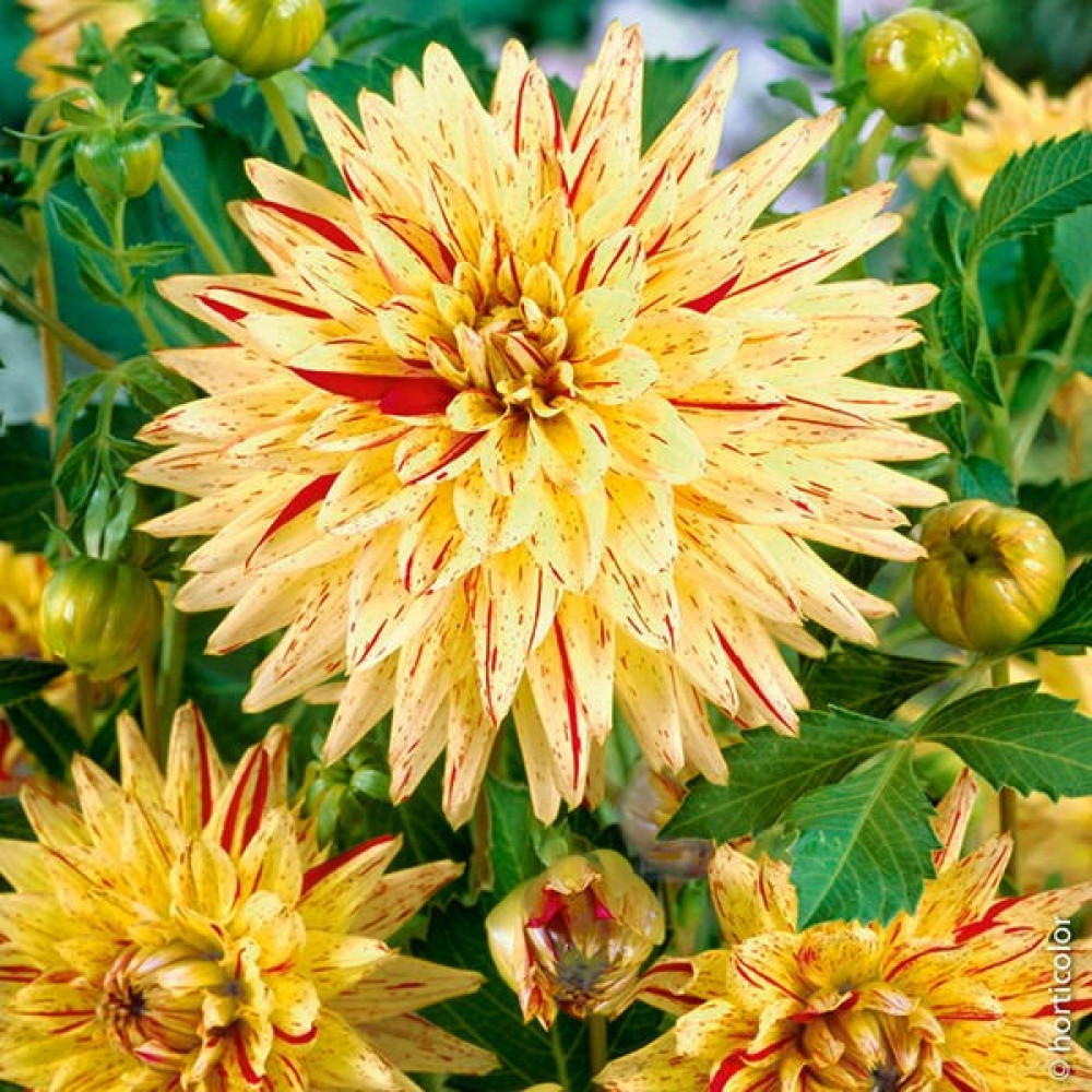 Многолетнее растение с крупными перистыми листьями и оригинальными соцветиями-корзинками. Цвет желтый с красными полосками и штрихами. Сорт яркий, запоминающийся, очень необычный.