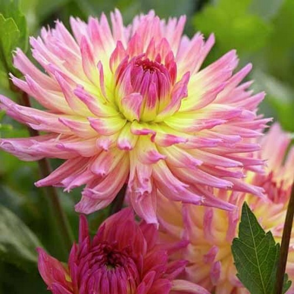 Георгина кактусовая Karma Sangria (Карма Сангрия) – очень привлекательный сорт! Высота растения 100 см. Цветок диаметром 15 см, розовый, с желтым центром, кончики лепестков расщеплены. Устойчив к дождю.