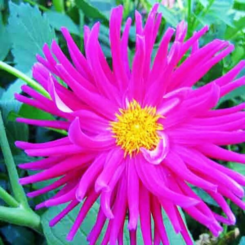 Причудливые цветы фиолетового цвета. Цветки небольшие, круглые, плотные, сердцевина ярко-желтая. Лепестки длинные, трубчатые, топорщатся вперед. Листья овальные окрашены в ярко-зеленый цвет.