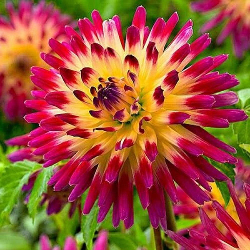 Ярчайший сорт! Лепестки скручены в изящные конусы. Окраска необыкновенная - двухцветные желто-малиновые лепестки. Эта георгина словно сияет. Отличный кандидат на роль главного героя на клумбе или в шикарном цветнике.