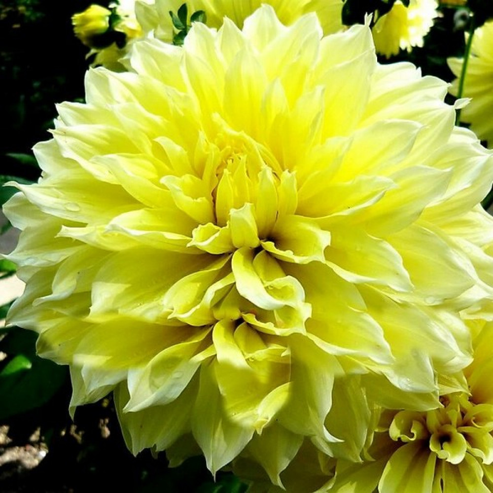 Среднерослый сорт. Густомахровые огромные цветки желтого цвета, с выровненными лепестками более мелкими у центра. Этот цветок завораживает, притягивая к себе взгляды. Стебли плотные, не требующие опоры.