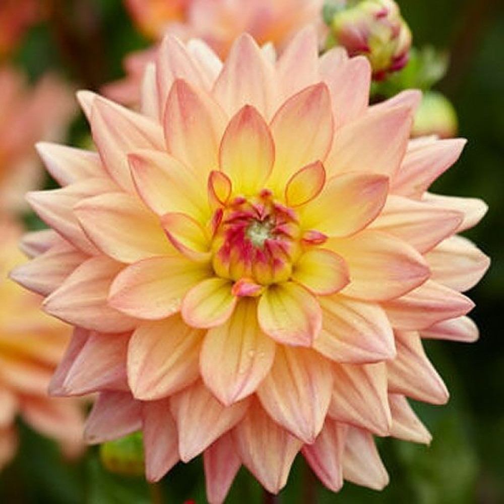 Георгина мелоди Dora (Дора) относится к группе бордюрных (низкорослых) георгин. Цветок апельсиново-лососевого цвета, с желтыми лепестками у основания и красной серединой. Отличительная черта этого вида георгин в том, что их не надо подвязывать и удалять боковые побеги. Они растут пышным невысоким кустиком. Непрерывно и продолжительно цветут, вплоть до самых заморозков. Прекрасно растут в вазонах и горшках. Служат для украшения террас, балконов и веранд. Очень эффектно смотрятся на внешней стороне бордюра. Высаживают георгины на хорошо освещенных, защищенных от ветра местах. Предпочитают легкую, плодородную землю. Георгины неприхотливы и легки в выращивании. Размножение происходит путем деления клубней. На зиму клубни выкапывают, просушивают и хранят в сухом прохладном месте. Количество в упаковке: 1 шт.