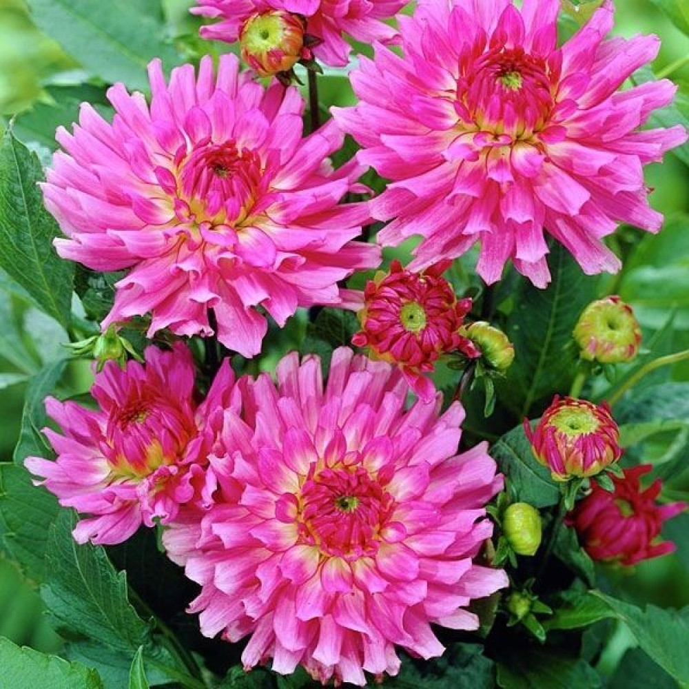 Относится к группе бордюрных (низкорослых) георгин. Цветок махровый, двухцветный. Лепестки ярко розового оттенка, плавно переходят в зелено-желтый цвет у основания. Отличительная черта этого вида георгин в том, что их не надо подвязывать и удалять боковые побеги. Они растут пышным невысоким кустиком. Непрерывно и продолжительно цветут, вплоть до самых заморозков. Высаживают георгины на хорошо освещенных, защищенных от ветра местах. Предпочитают легкую, плодородную землю. Георгины неприхотливы и легки в выращивании. Размножение происходит путем деления клубней. На зиму клубни выкапывают, просушивают и хранят в сухом прохладном месте. Прекрасно растут в вазонах и горшках. Служат для украшения террас, балконов и веранд. Очень эффектно смотрятся на внешней стороне бордюра.
