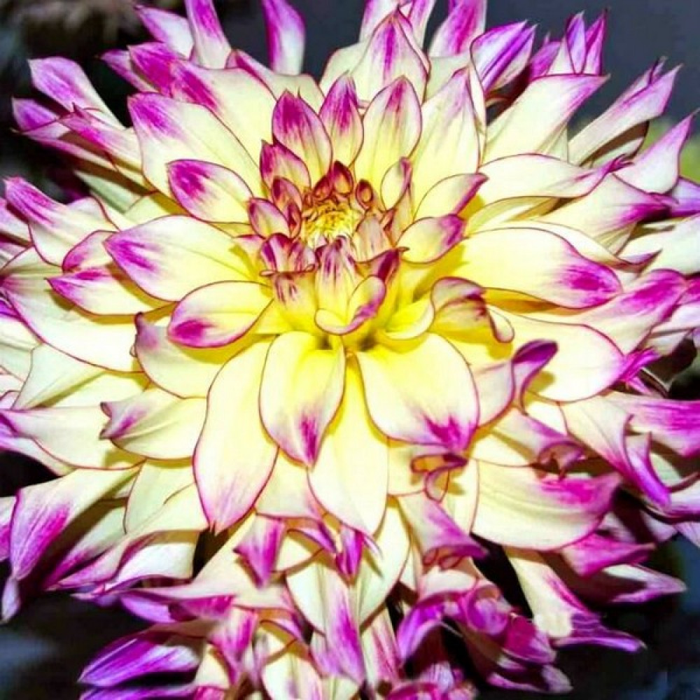 Цветение: очень эффектный, ванильно-жёлтый с лиловым кантом и лиловым мазком по краю лепестка, лепестки по краю скручиваются.