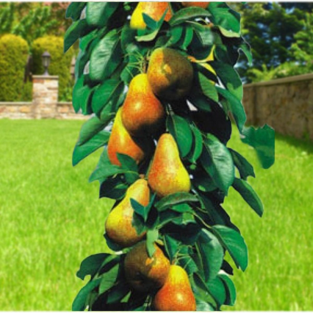Компактно растущее дерево с колоновидной кроной. Высота растения не более 2-2,5 м, поэтому уход и сбор урожая не представляют трудностей. Облиственность умеренная, листва и плоды образуются на коротких (до 15 см в длину) веточках. Спелые груши крупные, сочные и мясистые. Окрас тонкой кожицы – нежно-желтый с мягким малиновым румянцем.