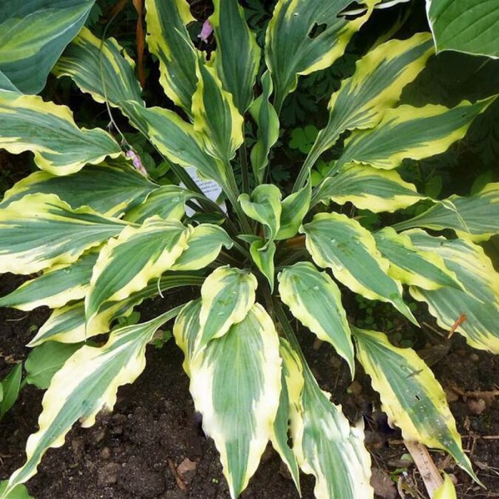 У этой хосты плотная, длинная, волнистая листва очень красивой расцветки. Зелено-голубую середину обрамляют сливочные языки-полоски, которые заходят на середину листа. С каждым годом она становится красивееи красивее.