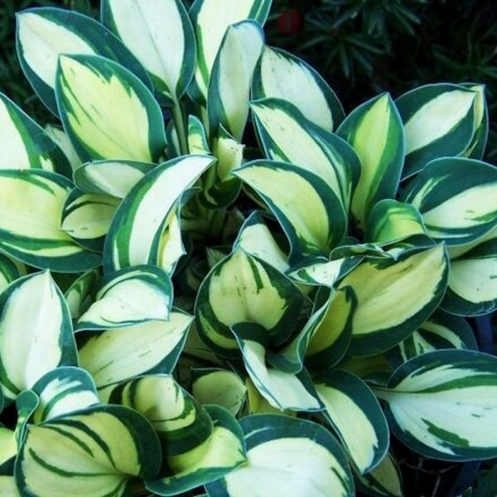 Эта хоста имеет аккуратные плотные овальные листья. Сливочно-кремовый центр со временем меняется на белый. Сине-зеленая, не регулярная кайма.