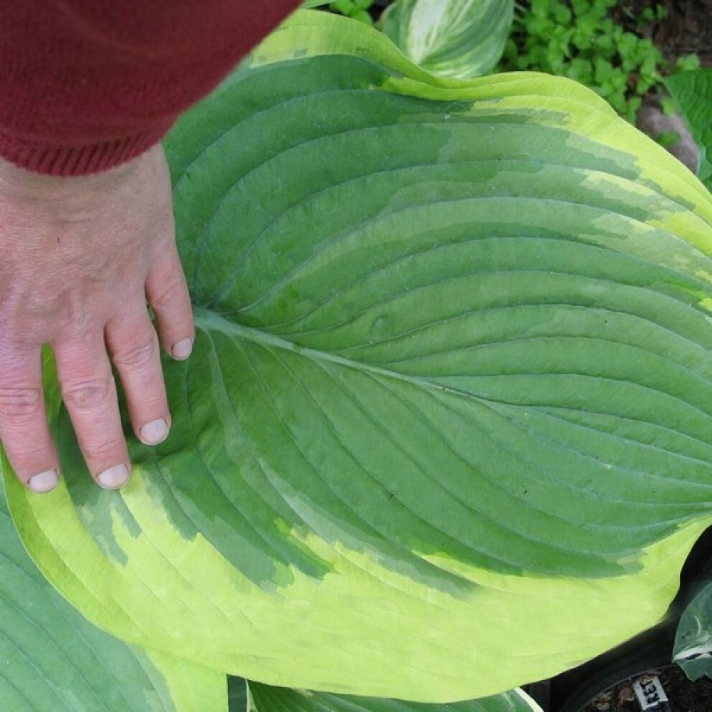 Гигантская хоста! Листья округло-удлиненные, с острым кончиком и хорошо читаемыми прожилками. По краю листовой пластины идет размытая светлая полоса желтого или молочного цвета.