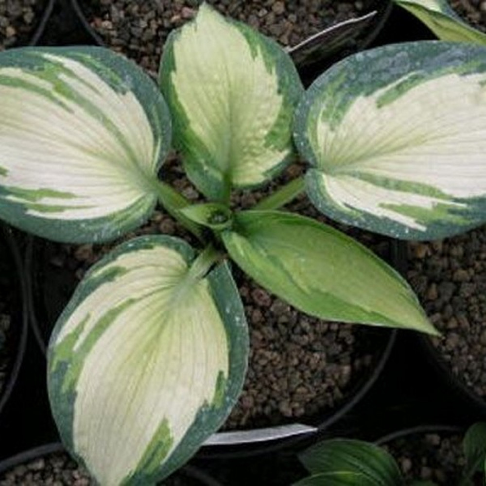 У этой хосты очень красивые листья с прожилками и не ровными краями. Край листа яркий, зелено-синий, а серединка светло желтая, которая к концу сезона становиться сливочно-белой. Цветки белые.