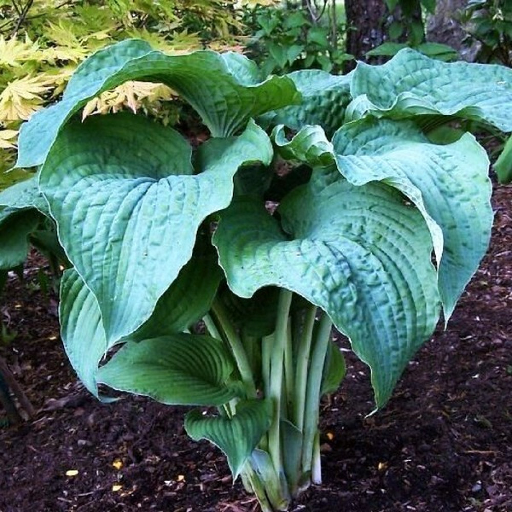 Гигантская хоста! Голубые плотные листья в форме сердца с волнистым краем на длинных толстых черешках, расположены горизонтально. Изысканный букет из листьев!