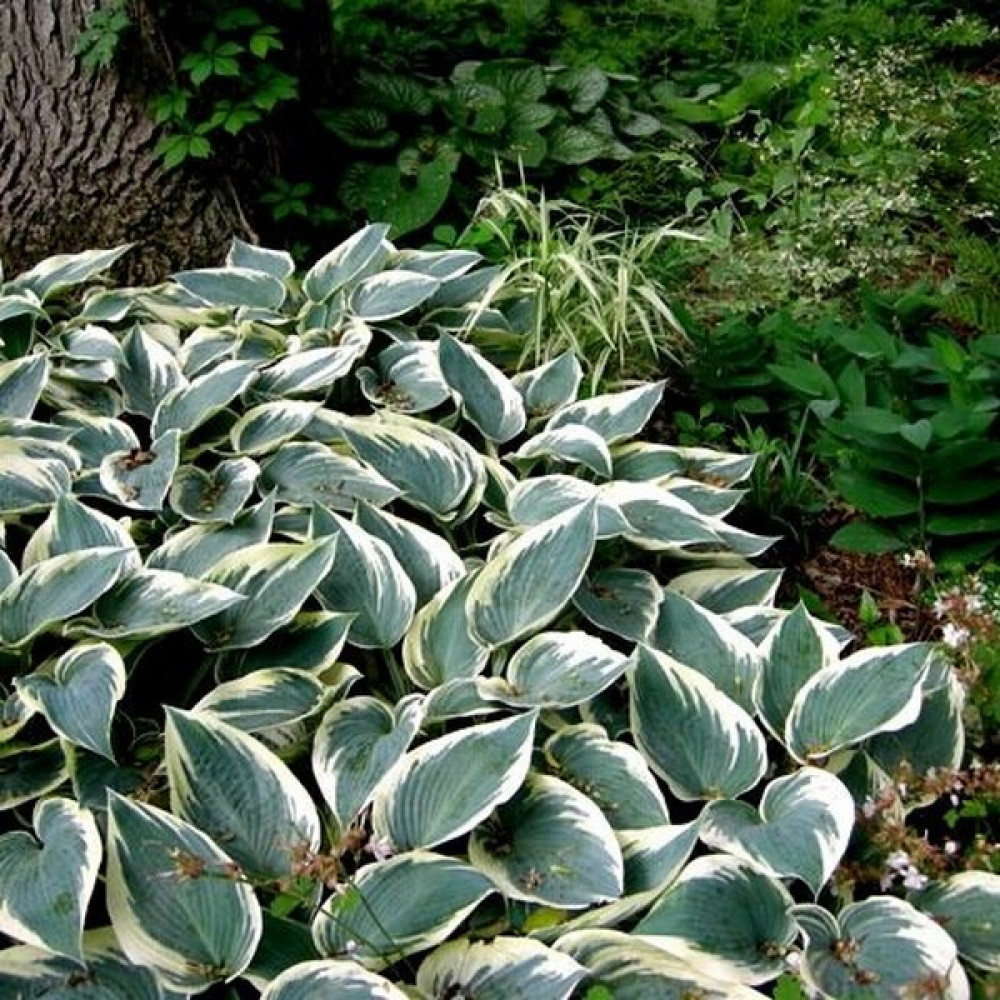 Роскошная яркая хоста. Интенсивно-голубые листья обрамлены неравномерной каймой цвета слоновой кости, которая расширяется со временем. Цветки светло-лавандовые с пурпурными полосками. Эту хосту следует посадить в тени, где наиболее ярко проявляется ее красота, и голубые листья приобратают синеву, а кайма становится ослепительно белой! Красавица!!! Не повреждается слизнями.