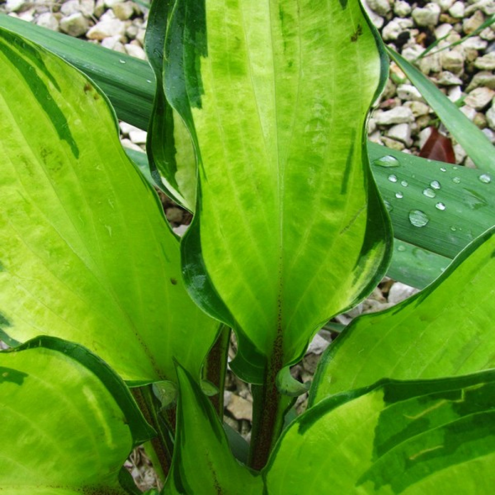 Замечательная и неприхотливая маленькая хоста. Очаровательные листочки сердцевидной формы, в центре окрашены в сливочно-кремовый цвет и окаймлены вначале светло-зелёным, а затем зелёно-голубым. Черешки листьев и цветоносы - с бордовым оттенком.