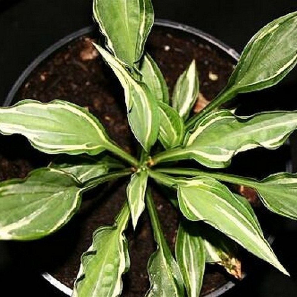 Листья стреловидные, плотные, волнистые, тёмно-зелёные с молочно-зеленоватым центром, который преображается в золотистый. Белоснежной границей разделяет два цвета. Цветы светло-лавандовые.