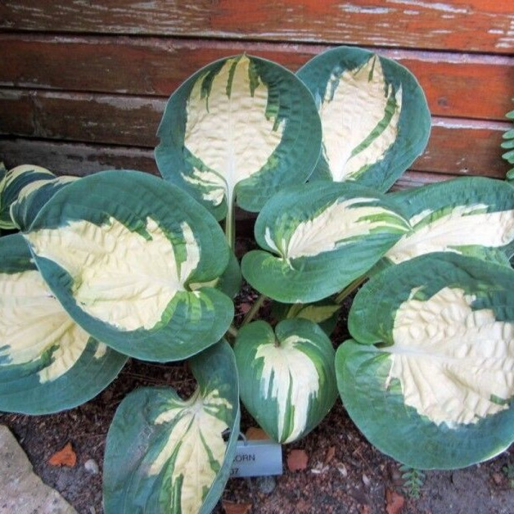 Листья округлые кремово-белые, с широкой зелено-голубой кромкой, с возрастом листва становится морщинистой. Куст компактный.