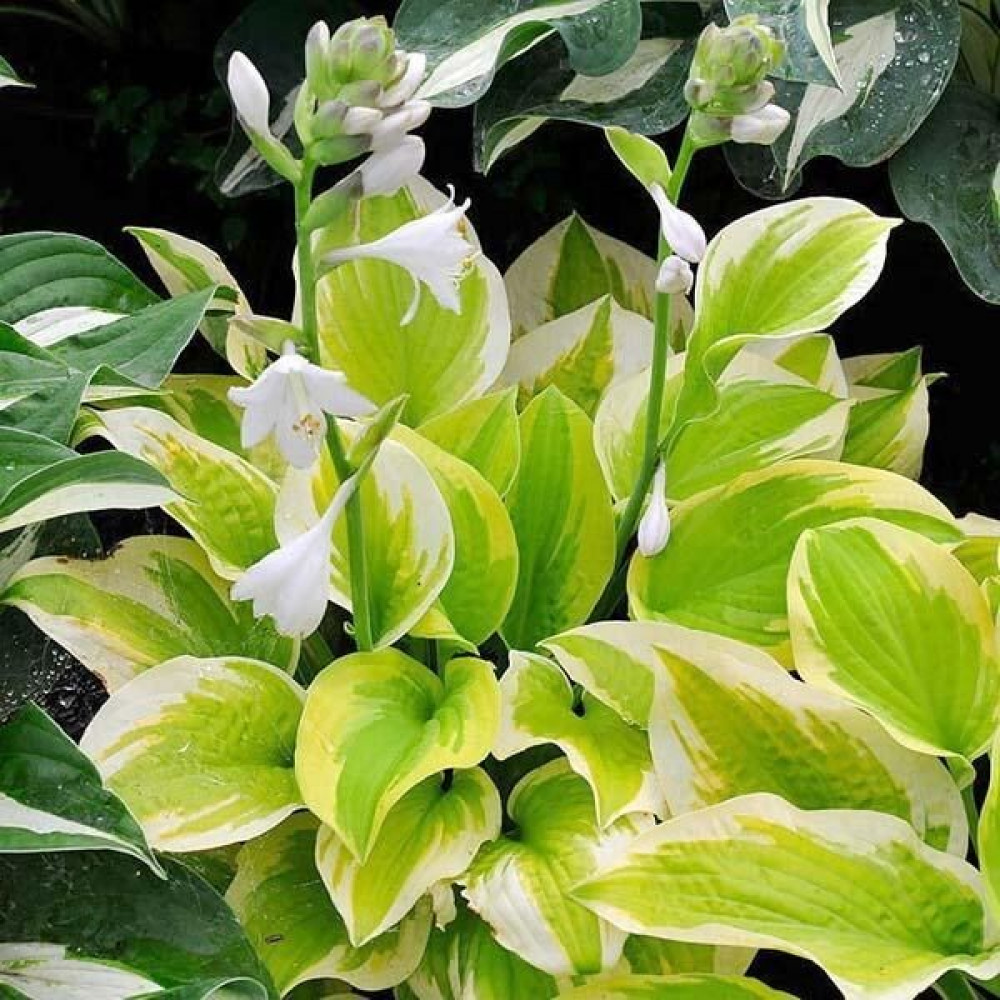Относится к классу лилейных, является многолетним травянистым растением, характеризующимся светло-зеленой окраской центра листа, плавно переходящим в золотой. По краю листа присутствует белая кайма, а сам лист имеет специфическую сердцевидную форму. Растение прекрасно справляется с декоративной функцией при обустройстве клумб, розариев и цветников.