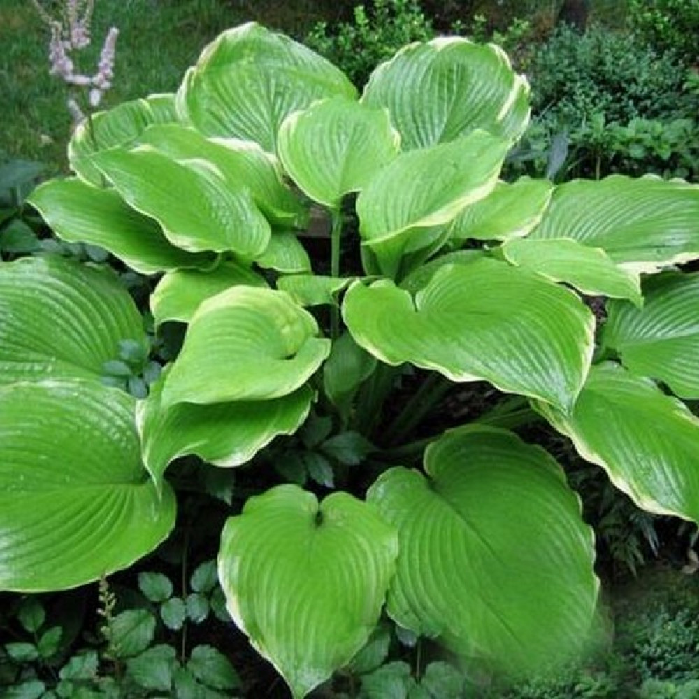 Крупная хоста. Красивые, блестящие, зелёные с нерегулярной белой каймой листья. Цветки лавандовые.