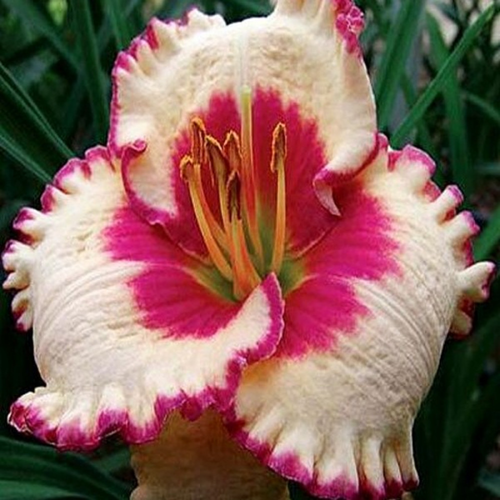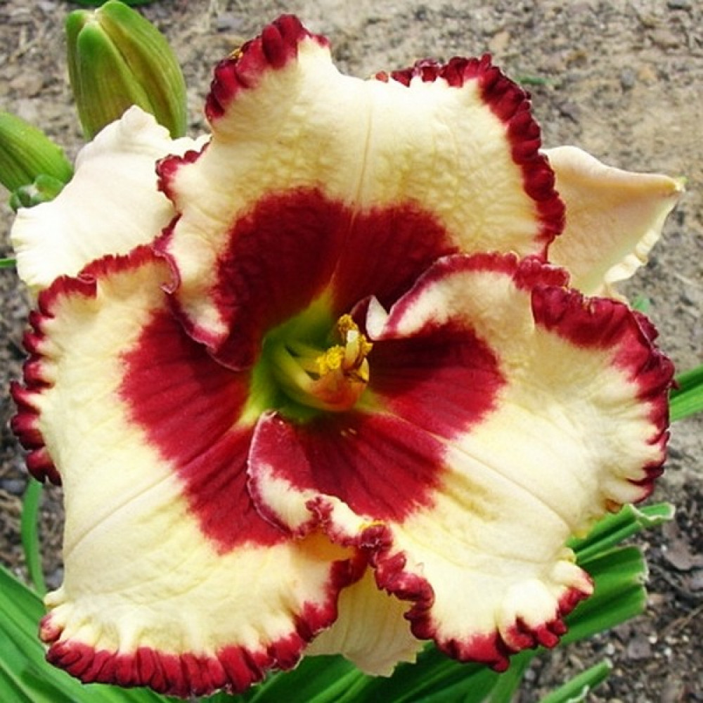 Кремовый цветок с красным глазком и такого же цвета гофрированная окантовка. Очень красив!!! Ароматный! Высота - 60-70 см, диаметр - 14 см.