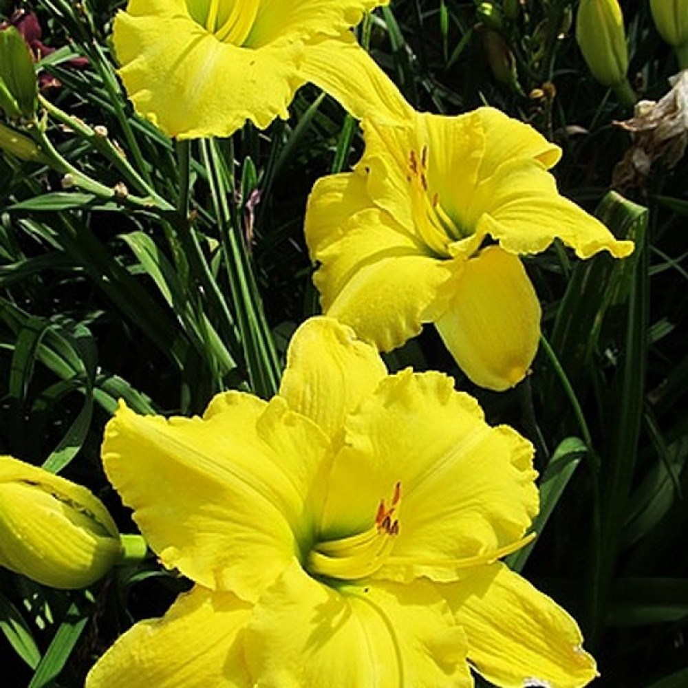 Ярко-желтый лилейник с зеленым горлом. Высота растения - 76 см, диаметр цветков 17 см.