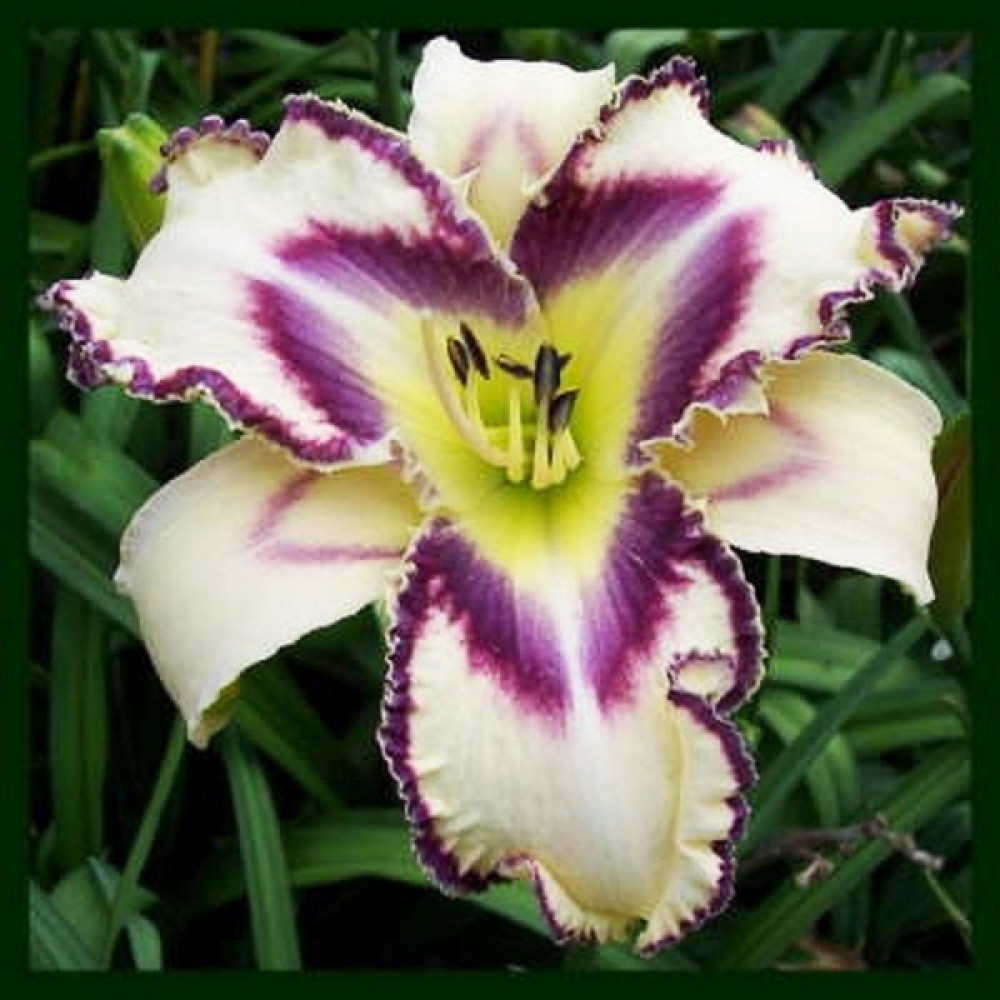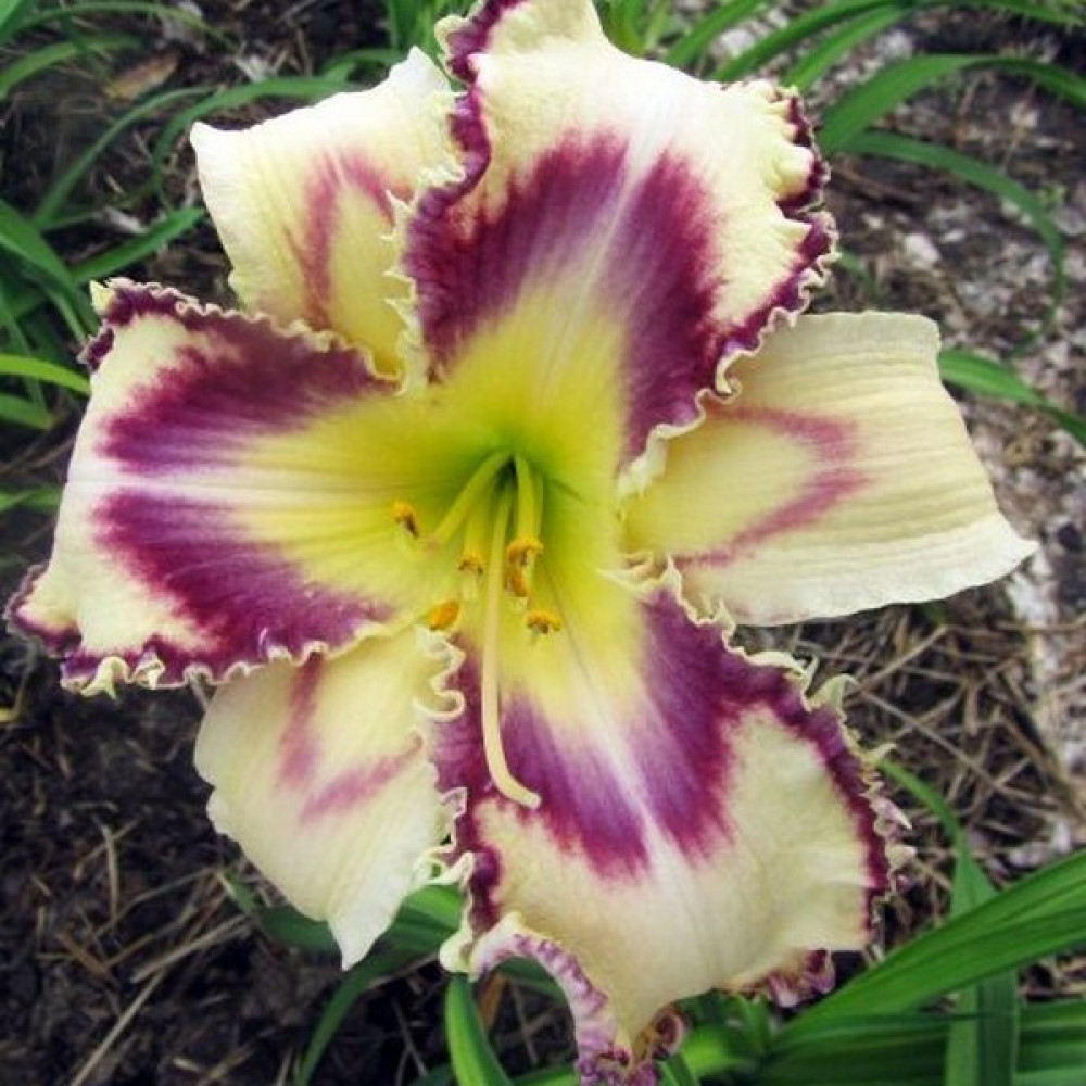 Высота - 70 см, диаметр цветка - 16 см. Кремовый, с красно-пурпурным глазом и двойной красно-пурпурно-белой зубчатой окантовкой.