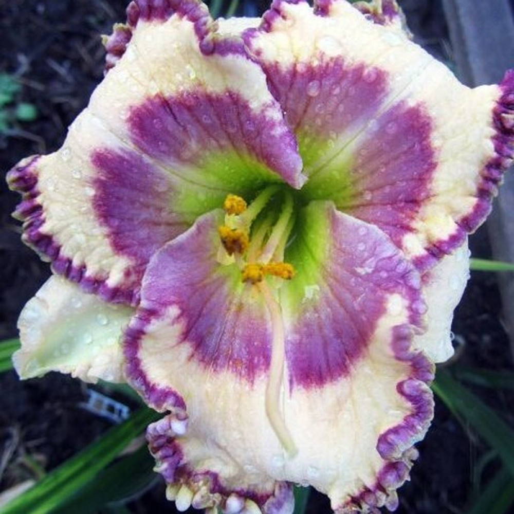 Высота - 70 см, диаметр цветка - 15 см. Цвет слоновой кости, с бледно-серо-голубым глазом, переходящим в фиолетовый, фиолетово-пурпурно-золотая кайма.
