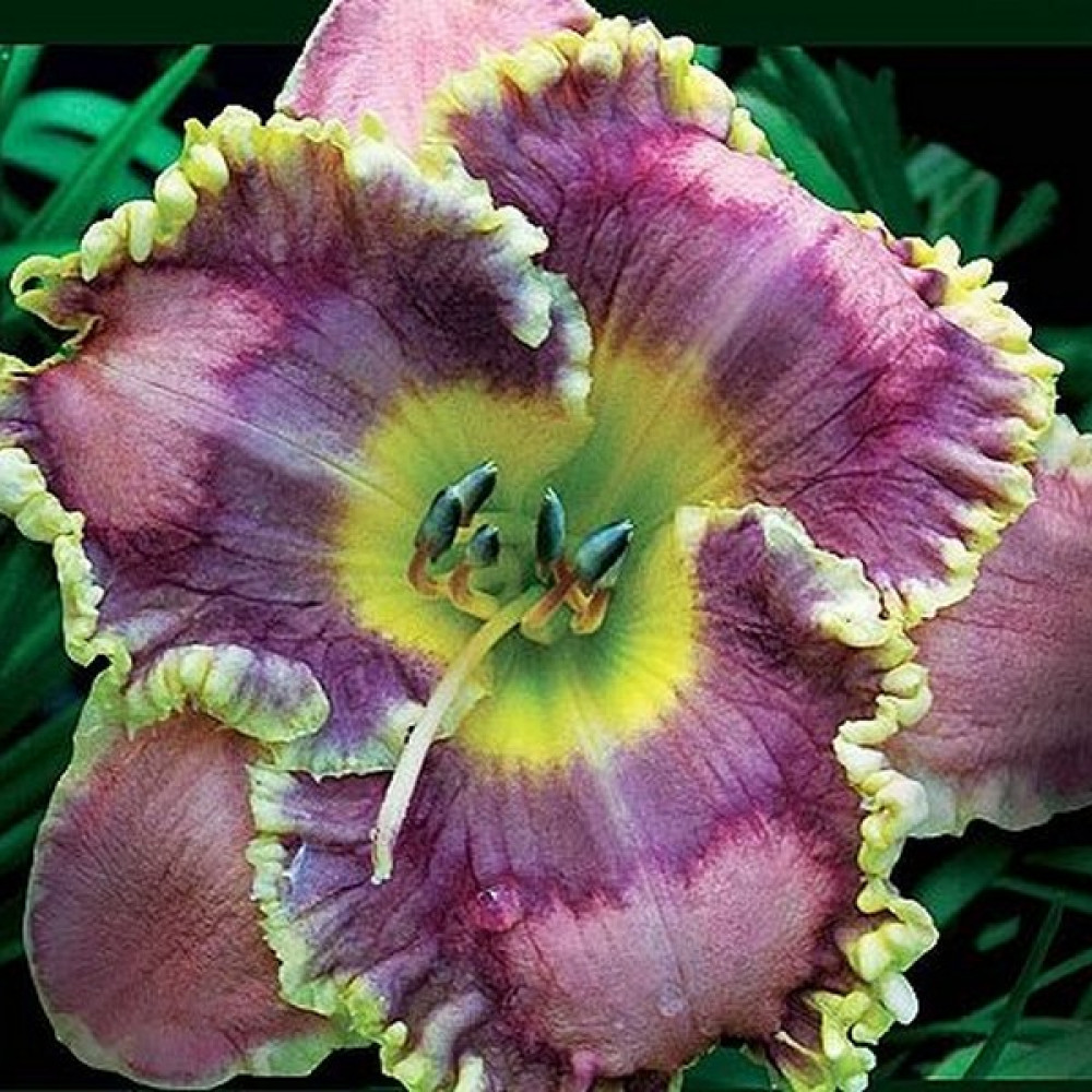 Высота - 71 см, диаметр цветка - 15 см. Фиолетово-лавандовый с зеленым горлом и широкой петельчатой золотистой каймой. Полувечнозеленый тетраплоид.