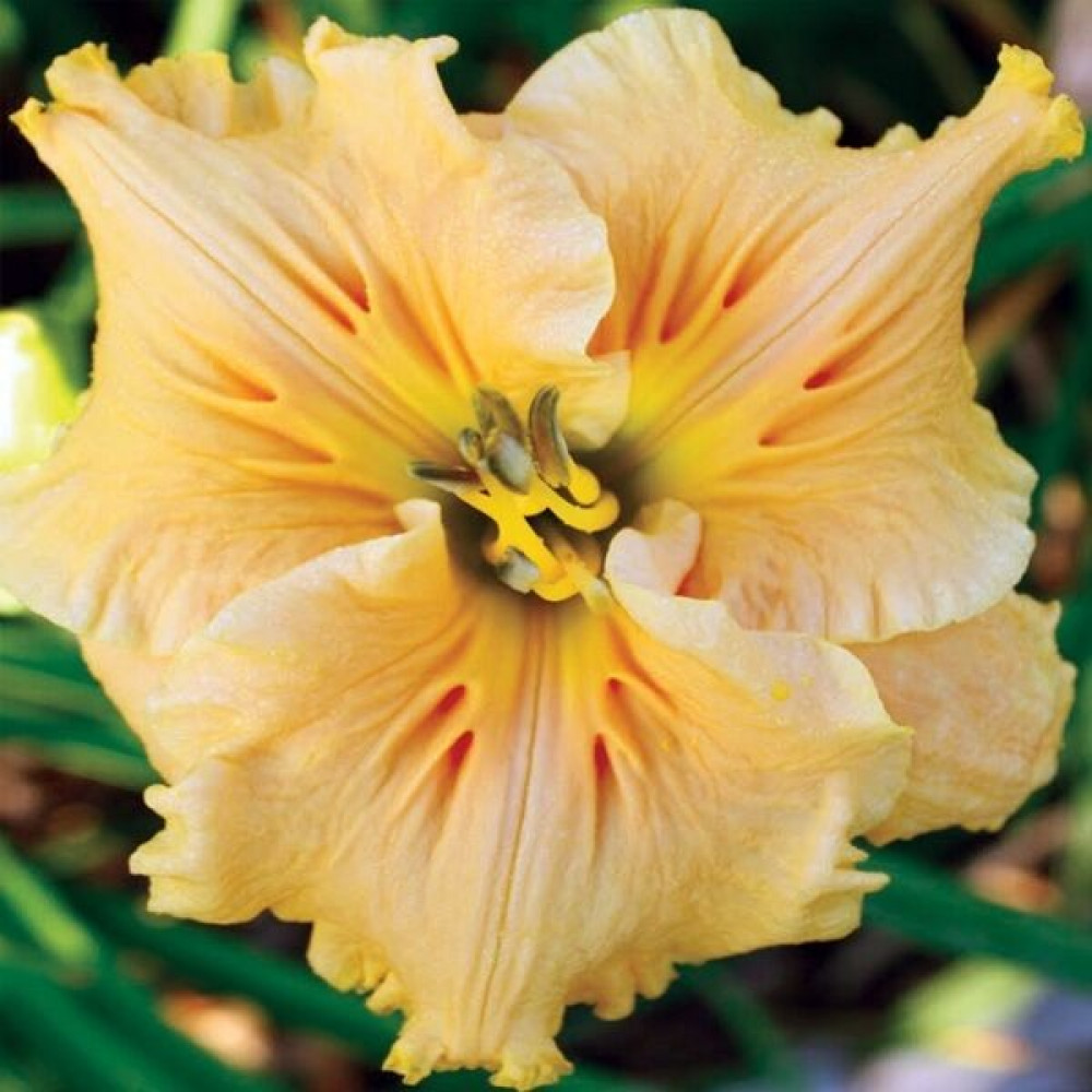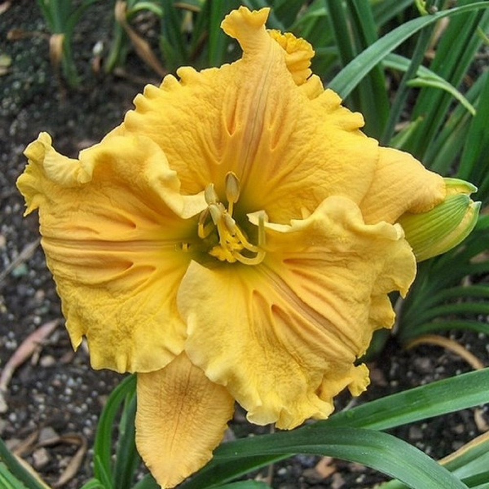 Цветок золотой с зеленым горлом и гофрированными краями лепестков. Очень ароматный. Цветение обильное. Цветы очень эффектные - с рельефным рисунком в виде пера по центру лепестка! Повторноцветущий. Листва узкая, мечевидная.