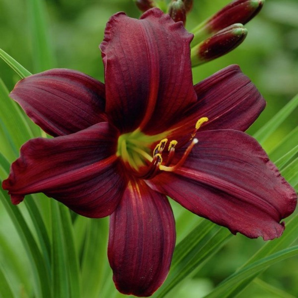 Крупноцветковый сорт, зеленое горло, чёрно-фиолетовые лепестки. Идеальный выбор для цветников, пейзажных композиций, миксбордеров.