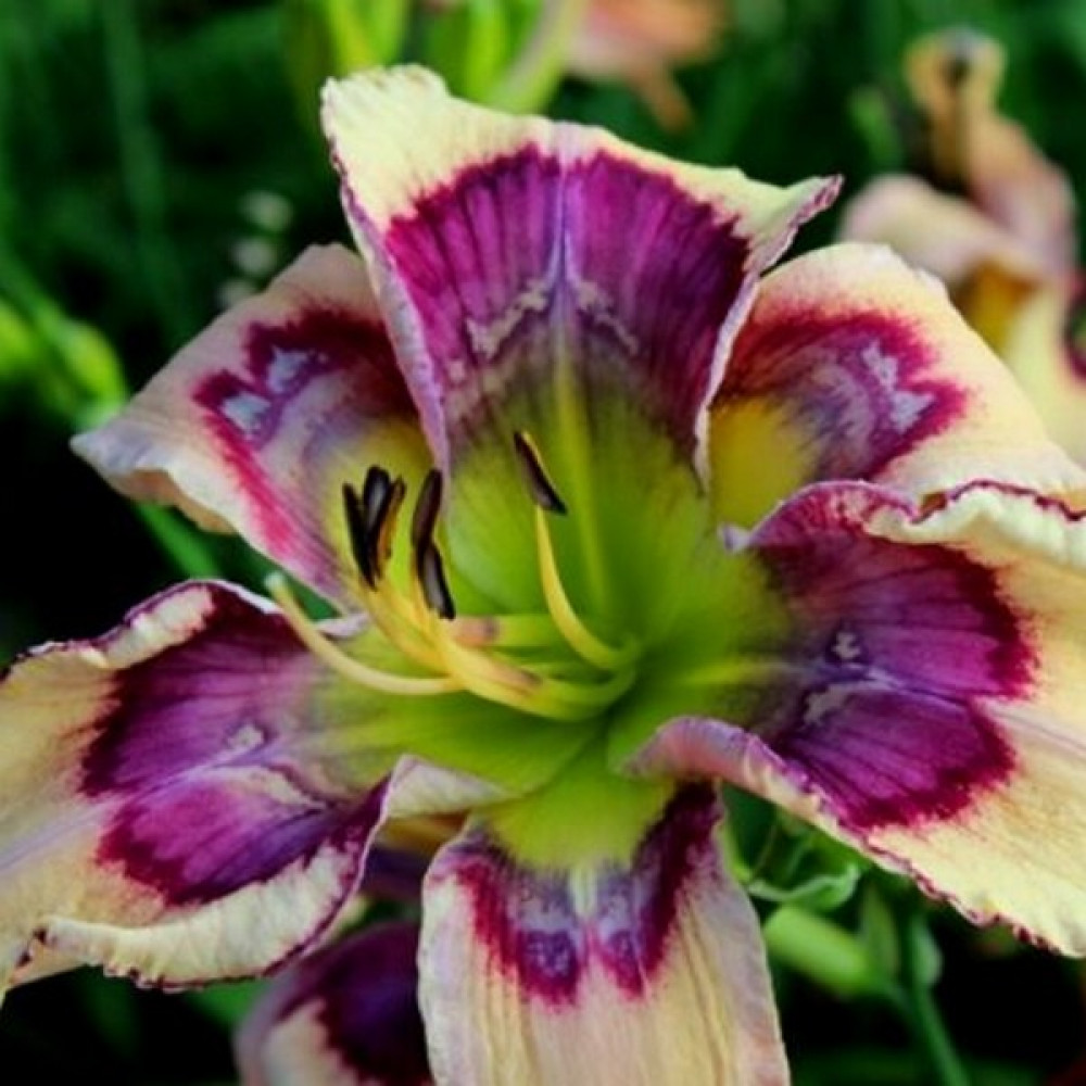Высота растения - 107 см, диаметр цветка - 18 см. Многогранный калейдоскопный глаз как сочетание лилового, голубого и винно-красного на кремово-лимонных лепестках. Большое зеленое горло. Уникальный среди многих.